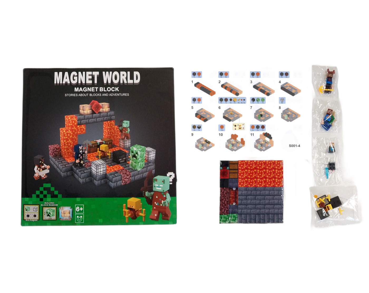 Sada obsahuje různé bloky pro stavbu scén s lávovými sloupy, truhlami s pokladem a nepřáteli, jako jsou Creeper, zombíci a skeleton. Nechybí ani hrdinové s krumpáčem a mečem. Všechny dílky jsou magnetické, snadno se skládají a přestavují.