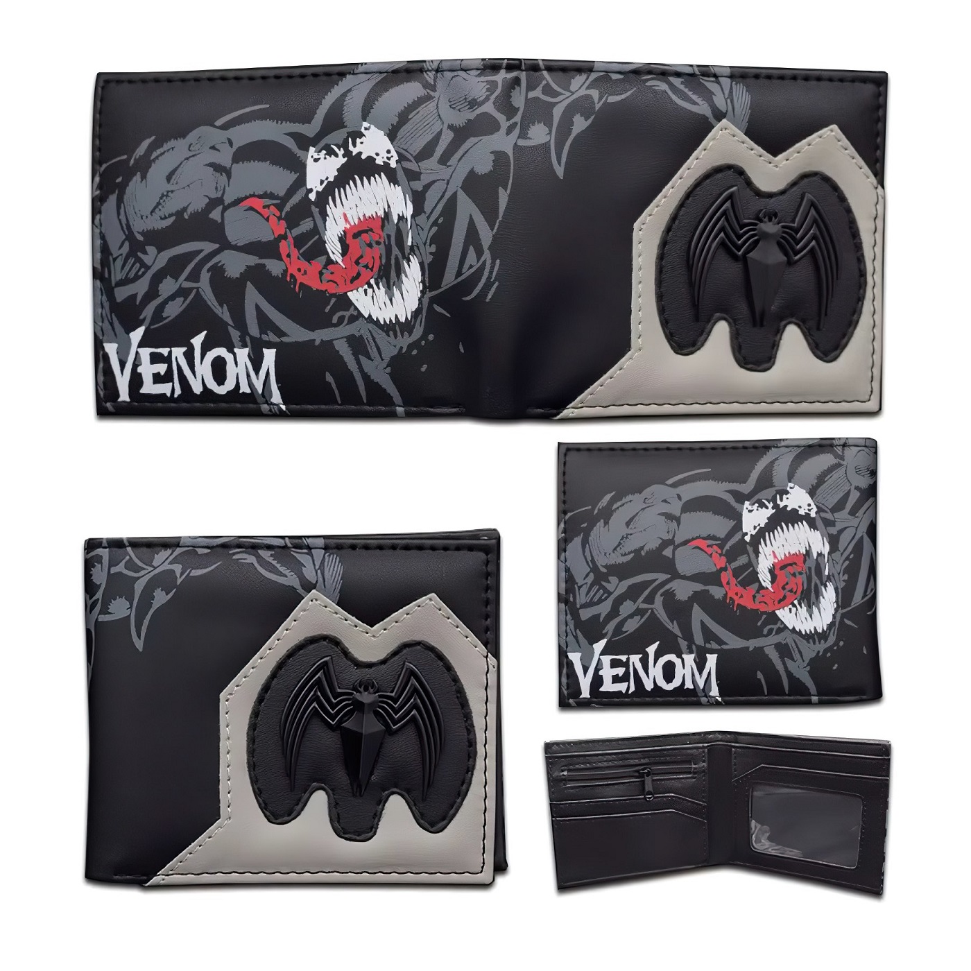 Design je inspirován temným a nebezpečným vzhledem Venoma, což podtrhuje černý základ s grafickým potiskem jeho hrozivé tváře a rudého jazyka. Nápis "Venom" v bílém kontrastním písmu dodává celkovému vzhledu dramatický nádech. Na přední straně peněženky se navíc nachází 3D logo černého pavouka - logo Venoma, které je umístěno na šedém koženém detailu, čímž vytváří zajímavý vizuální efekt.