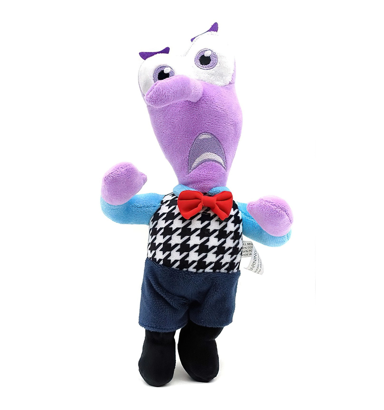 Hračka je vyrobena z příjemného a měkkého plyše, ideálního na mazlení. Má detailně propracovaný obličej, fialovou barvu pleti a výrazné oči plné obav. Je oblečený do stylové vesty s černobílým vzorem, modrého trička a červeného motýlku, což podtrhuje jeho filmový vzhled.