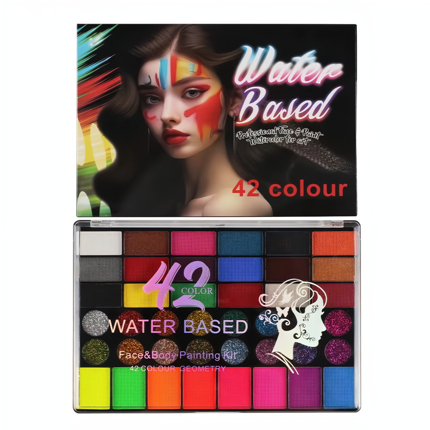 - 42 kusů barev na obličej a tělo v praktickém otevíracím balení – různorodá paleta odstínů včetně neonových a třpytivých barev